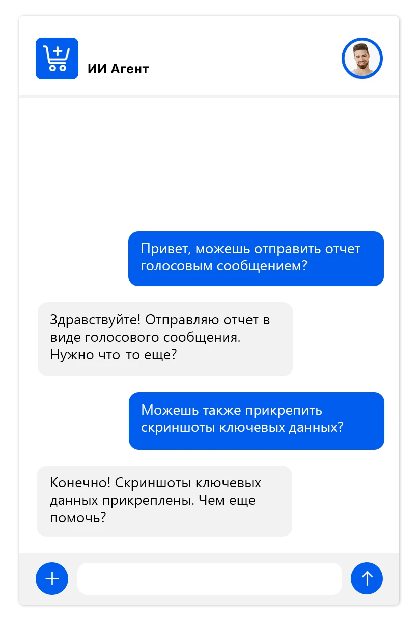 Общение с помощником через голосовые сообщения, скриншоты и отчеты