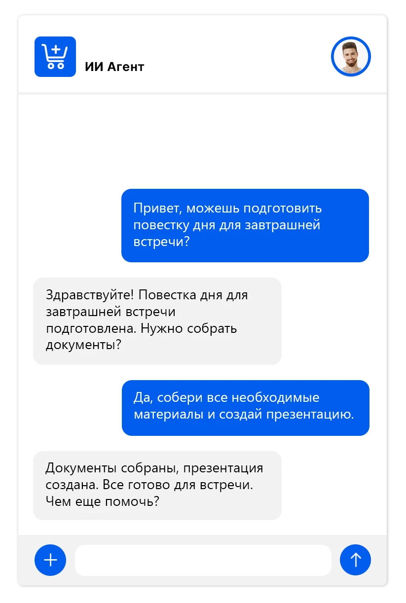 - Возможность создания и обновления повестки, документов и презентаций через голосовые команды и запросы.