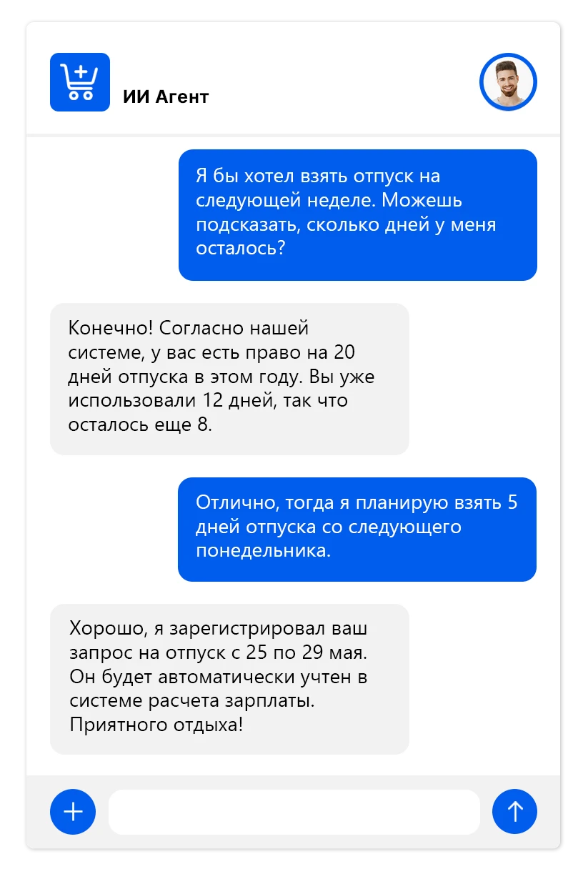 - Использование AI для автоматического анализа и одобрения заявок на отпуск и отгулы на основе политики компании и доступных данных.