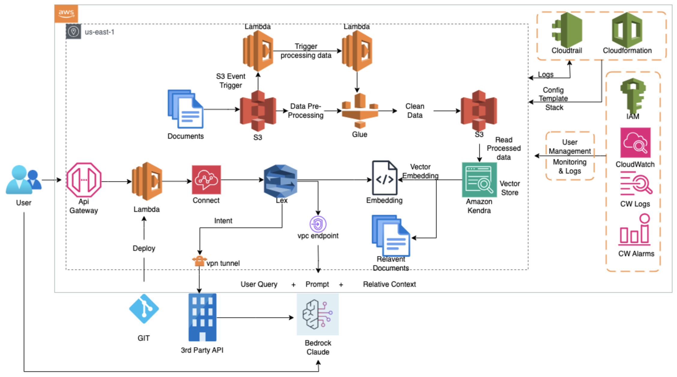 - Компоненты системы: Внедрение сервисов AWS, таких как Amazon Kendra, Amazon S3, AWS Glue, Amazon EC2, AWS Lex и Bedrock Claude, для создания комплексного решения.