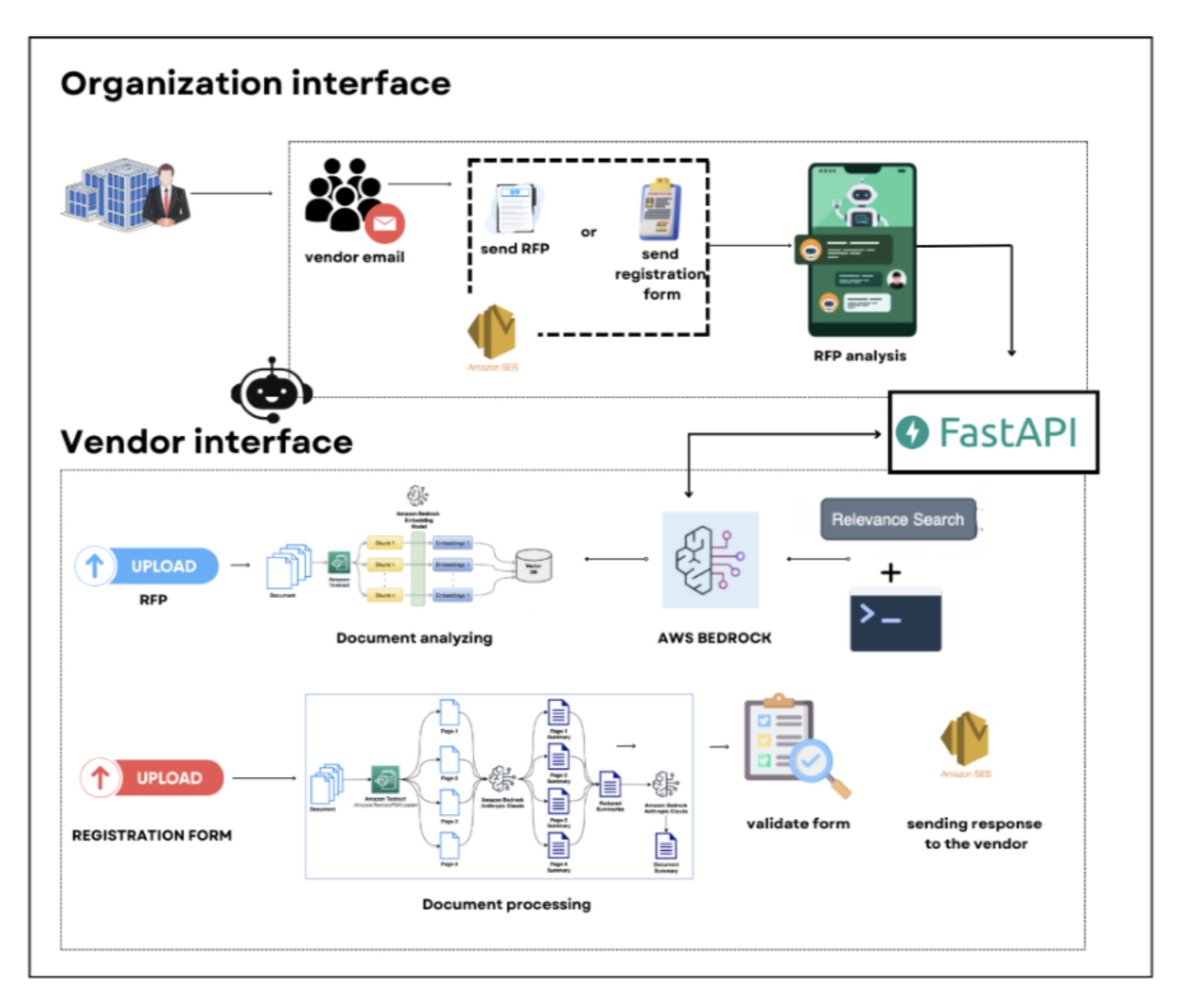 - Анализ запросов предложений: Поставщики загружают RFP, которые анализируются ИИ на базе AWS Bedrock с помощью методов обработки естественного языка (NLP).
