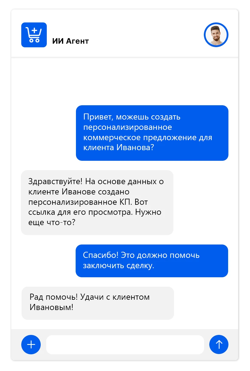- Автоматическое создание персонализированных коммерческих предложений (КП) на основе собранных данных о клиентах.